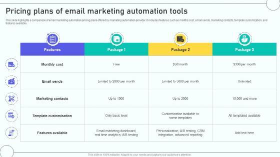 This slide highlights a comparison of email marketing automation pricing plans offered by marketing automation provider. It includes features such as monthly cost, email sends, marketing contacts, template customization, and features available. Do you know about Slidesgeeks Email Marketing Automation Process Pricing Plans Of Email Marketing Automation These are perfect for delivering any kind od presentation. Using it, create PowerPoint presentations that communicate your ideas and engage audiences. Save time and effort by using our pre-designed presentation templates that are perfect for a wide range of topic. Our vast selection of designs covers a range of styles, from creative to business, and are all highly customizable and easy to edit. Download as a PowerPoint template or use them as Google Slides themes. This slide highlights a comparison of email marketing automation pricing plans offered by marketing automation provider. It includes features such as monthly cost, email sends, marketing contacts, template customization, and features available.