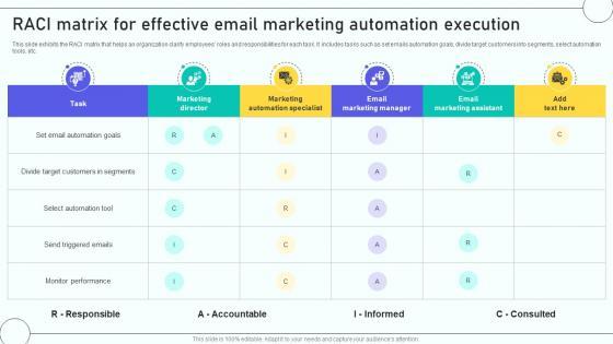 This slide exhibits the RACI matrix that helps an organization clarify employees roles and responsibilities for each task. It includes tasks such as set emails automation goals, divide target customers into segments, select automation tools, etc. Create an editable Email Marketing Automation Process RACI Matrix For Effective Email Marketing that communicates your idea and engages your audience. Whether you are presenting a business or an educational presentation, pre-designed presentation templates help save time. Email Marketing Automation Process RACI Matrix For Effective Email Marketing is highly customizable and very easy to edit, covering many different styles from creative to business presentations. Slidegeeks has creative team members who have crafted amazing templates. So, go and get them without any delay. This slide exhibits the RACI matrix that helps an organization clarify employees roles and responsibilities for each task. It includes tasks such as set emails automation goals, divide target customers into segments, select automation tools, etc.