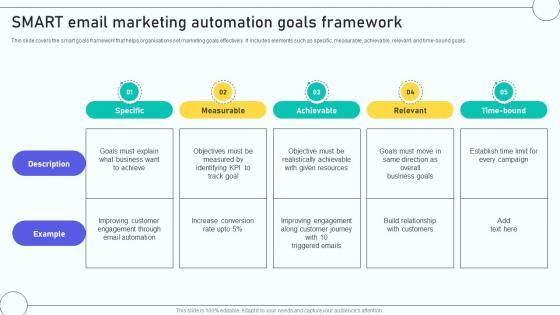 This slide covers the smart goals framework that helps organisations set marketing goals effectively. It includes elements such as specific, measurable, achievable, relevant, and time-bound goals. There are so many reasons you need a Email Marketing Automation Process Smart Email Marketing Automation Goals. The first reason is you can not spend time making everything from scratch, Thus, Slidegeeks has made presentation templates for you too. You can easily download these templates from our website easily. This slide covers the smart goals framework that helps organisations set marketing goals effectively. It includes elements such as specific, measurable, achievable, relevant, and time-bound goals.