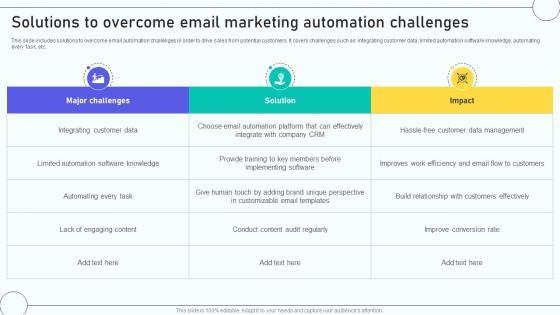 This slide includes solutions to overcome email automation challenges in order to drive sales from potential customers. It covers challenges such as integrating customer data, limited automation software knowledge, automating every task, etc. Do you have to make sure that everyone on your team knows about any specific topic I yes, then you should give Email Marketing Automation Process Solutions To Overcome Email Marketing a try. Our experts have put a lot of knowledge and effort into creating this impeccable Email Marketing Automation Process Solutions To Overcome Email Marketing. You can use this template for your upcoming presentations, as the slides are perfect to represent even the tiniest detail. You can download these templates from the Slidegeeks website and these are easy to edit. So grab these today This slide includes solutions to overcome email automation challenges in order to drive sales from potential customers. It covers challenges such as integrating customer data, limited automation software knowledge, automating every task, etc.