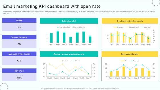 The following slide exhibits the KPI dashboard that measures the effectiveness of the email automation campaign. It includes elements such as a number of subscribers, new subscribers, bounce rate, unsubscribe rate, total email sent, etc. Slidegeeks is one of the best resources for PowerPoint templates. You can download easily and regulate A4 Email Marketing Automation Process To Email Marketing KPI Dashboard With Open Rate for your personal presentations from our wonderful collection. A few clicks is all it takes to discover and get the most relevant and appropriate templates. Use our Templates to add a unique zing and appeal to your presentation and meetings. All the slides are easy to edit and you can use them even for advertisement purposes. The following slide exhibits the KPI dashboard that measures the effectiveness of the email automation campaign. It includes elements such as a number of subscribers, new subscribers, bounce rate, unsubscribe rate, total email sent, etc.