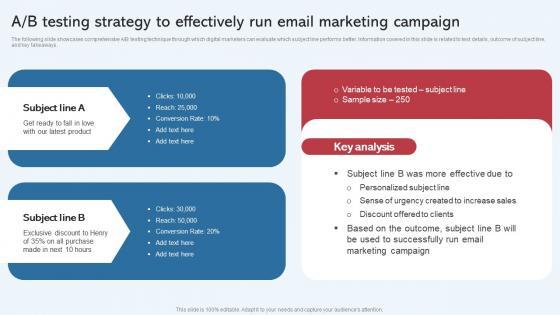 The following slide showcases comprehensive A B testing technique through which digital marketers can evaluate which subject line performs better. Information covered in this slide is related to test details, outcome of subject line, and key takeaways. Find a pre-designed and impeccable A B Testing Strategy To Effectively Run Email Effective GTM Techniques Themes PDF. The templates can ace your presentation without additional effort. You can download these easy-to-edit presentation templates to make your presentation stand out from others. So, what are you waiting for Download the template from Slidegeeks today and give a unique touch to your presentation. The following slide showcases comprehensive A B testing technique through which digital marketers can evaluate which subject line performs better. Information covered in this slide is related to test details, outcome of subject line, and key takeaways.
