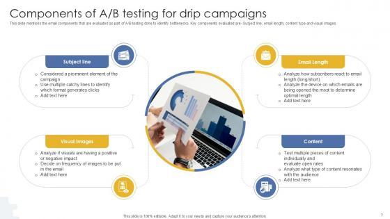 This slide mentions the email components that are evaluated as part of A B testing done to identify bottlenecks. Key components evaluated are- Subject line, email length, content type and visual images. Slidegeeks is one of the best resources for PowerPoint templates. You can download easily and regulate Components Of AB Testing For Formulating Drip Email Marketing PPT Presentation MKT SS V for your personal presentations from our wonderful collection. A few clicks is all it takes to discover and get the most relevant and appropriate templates. Use our Templates to add a unique zing and appeal to your presentation and meetings. All the slides are easy to edit and you can use them even for advertisement purposes. This slide mentions the email components that are evaluated as part of A B testing done to identify bottlenecks. Key components evaluated are- Subject line, email length, content type and visual images.