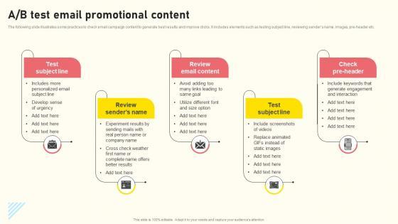 The following slide illustrates some practices to check email campaign content to generate best results and improve clicks. It includes elements such as testing subject line, reviewing senders name, images, pre-header etc. Slidegeeks has constructed A B Test Email Promotional Content Ppt Model Slides PDF after conducting extensive research and examination. These presentation templates are constantly being generated and modified based on user preferences and critiques from editors. Here, you will find the most attractive templates for a range of purposes while taking into account ratings and remarks from users regarding the content. This is an excellent jumping-off point to explore our content and will give new users an insight into our top-notch PowerPoint Templates.