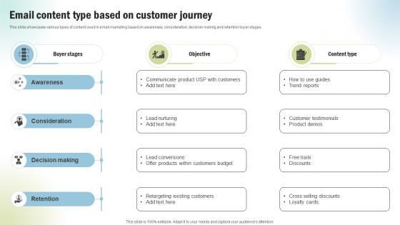 This slide showcases type of content used in email marketing campaign which helps in attracting potential customers and increase brand awareness. It includes elements such as trend reports, customer testimonials, discount offers, live demos etc. From laying roadmaps to briefing everything in detail, our templates are perfect for you. You can set the stage with your presentation slides. All you have to do is download these easy-to-edit and customizable templates. B2B Marketing Techniques Types Of Email Content Based On Customer Journey will help you deliver an outstanding performance that everyone would remember and praise you for. Do download this presentation today. This slide showcases type of content used in email marketing campaign which helps in attracting potential customers and increase brand awareness. It includes elements such as trend reports, customer testimonials, discount offers, live demos etc.