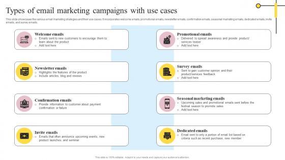 This slide showcases the various email marketing strategies and their use cases. It incorporates welcome emails, promotional emails, newsletter emails, confirmation emails, seasonal marketing emails, dedicated emails, invite emails, and survey emails. Presenting this PowerPoint presentation, titled Types Of Email Marketing Campaigns With Use Cases Definitive Guide On Mass Advertising Topics Pdf, with topics curated by our researchers after extensive research. This editable presentation is available for immediate download and provides attractive features when used. Download now and captivate your audience. Presenting this Types Of Email Marketing Campaigns With Use Cases Definitive Guide On Mass Advertising Topics Pdf. Our researchers have carefully researched and created these slides with all aspects taken into consideration. This is a completely customizable Types Of Email Marketing Campaigns With Use Cases Definitive Guide On Mass Advertising Topics Pdf that is available for immediate downloading. Download now and make an impact on your audience. Highlight the attractive features available with our PPTs. This slide showcases the various email marketing strategies and their use cases. It incorporates welcome emails, promotional emails, newsletter emails, confirmation emails, seasonal marketing emails, dedicated emails, invite emails, and survey emails.