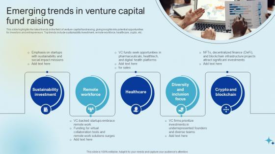 This slide highlights the latest trends in the field of venture capital fundraising, giving insights into potential opportunities for investors and entrepreneurs. Top trends include sustainability investment, remote workforce, healthcare, crypto, etc. Do you have an important presentation coming up Are you looking for something that will make your presentation stand out from the rest Look no further than Emerging Trends In Venture Capital Fund Raising Raising Venture Capital A Holistic Approach Fin SS V. With our professional designs, you can trust that your presentation will pop and make delivering it a smooth process. And with Slidegeeks, you can trust that your presentation will be unique and memorable. So why wait Grab Emerging Trends In Venture Capital Fund Raising Raising Venture Capital A Holistic Approach Fin SS V today and make your presentation stand out from the rest This slide highlights the latest trends in the field of venture capital fundraising, giving insights into potential opportunities for investors and entrepreneurs. Top trends include sustainability investment, remote workforce, healthcare, crypto, etc.