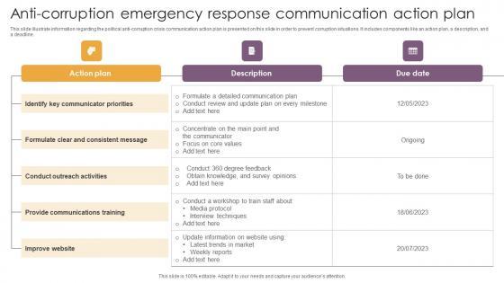 This slide illustrate information regarding the political anti-corruption crisis communication action plan is presented on this slide in order to prevent corruption situations. It includes components like an action plan, a description, and a deadline. Showcasing this set of slides titled Anti Corruption Emergency Response Communication Action Plan Structure Pdf The topics addressed in these templates are Communicator Priorities, Consistent Message, Improve Website All the content presented in this PPT design is completely editable. Download it and make adjustments in color, background, font etc. as per your unique business setting. This slide illustrate information regarding the political anti-corruption crisis communication action plan is presented on this slide in order to prevent corruption situations. It includes components like an action plan, a description, and a deadline.
