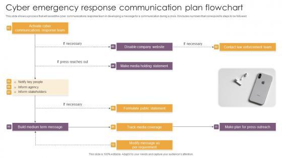 This slide shows a process that will assist the cyber communications response team in developing a message for a communication during a crisis. It includes numbers that correspond to steps to be followed Pitch your topic with ease and precision using this Cyber Emergency Response Communication Plan Flowchart Pictures Pdf This layout presents information on Communications Response Team, Company Website It is also available for immediate download and adjustment. So, changes can be made in the color, design, graphics or any other component to create a unique layout. This slide shows a process that will assist the cyber communications response team in developing a message for a communication during a crisis. It includes numbers that correspond to steps to be followed