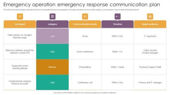 This slide showcase emergency operation incident communication plan across organization. It includes elements such as incident, category, communication mode, timeline and target audience Pitch your topic with ease and precision using this Emergency Operation Emergency Response Communication Plan Summary Pdf This layout presents information on Communication Mode, Target Audience, Timeline It is also available for immediate download and adjustment. So, changes can be made in the color, design, graphics or any other component to create a unique layout. This slide showcase emergency operation incident communication plan across organization. It includes elements such as incident, category, communication mode, timeline and target audience