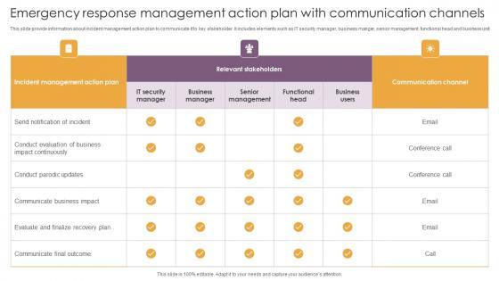 This slide provide information about incident management action plan to communicate it to key stakeholder. It includes elements such as IT security manager, business manger, senior management, functional head and business unit Showcasing this set of slides titled Emergency Response Management Action Plan With Communication Channels Elements Pdf The topics addressed in these templates are Incident Management Action Plan, Business Manager All the content presented in this PPT design is completely editable. Download it and make adjustments in color, background, font etc. as per your unique business setting. This slide provide information about incident management action plan to communicate it to key stakeholder. It includes elements such as IT security manager, business manger, senior management, functional head and business unit