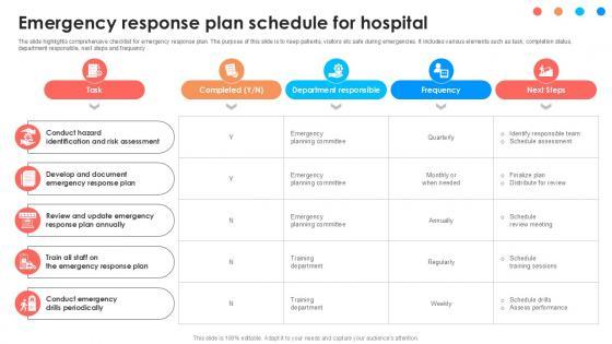 The slide highlights comprehensive checklist for emergency response plan. The purpose of this slide is to keep patients, visitors etc safe during emergencies. It includes various elements such as task, completion status, department responsible, next steps and frequency . There are so many reasons you need a Emergency Response Plan Schedule Comprehensive Approach To Strategic Planning Ppt Sample. The first reason is you can not spend time making everything from scratch, Thus, Slidegeeks has made presentation templates for you too. You can easily download these templates from our website easily. The slide highlights comprehensive checklist for emergency response plan. The purpose of this slide is to keep patients, visitors etc safe during emergencies. It includes various elements such as task, completion status, department responsible, next steps and frequency .