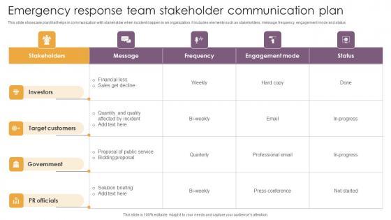 This slide showcase plan that helps in communication with stakeholder when incident happen in an organization. It includes elements such as stakeholders, message, frequency, engagement mode and status Showcasing this set of slides titled Emergency Response Team Stakeholder Communication Plan Clipart Pdf The topics addressed in these templates are Stakeholders, Target Customers, Engagement Mode All the content presented in this PPT design is completely editable. Download it and make adjustments in color, background, font etc. as per your unique business setting. This slide showcase plan that helps in communication with stakeholder when incident happen in an organization. It includes elements such as stakeholders, message, frequency, engagement mode and status