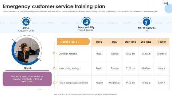 This slide illustrates an emergency training plan to be followed at the time of crisis. Various elements included in the plan are training topic, date, responsibility, issue to be addressed, no. of trainees, time of training, etc. Formulating a presentation can take up a lot of effort and time, so the content and message should always be the primary focus. The visuals of the PowerPoint can enhance the presenters message, so our Emergency Customer Service Training Plan Customer Service Training Ppt Example was created to help save time. Instead of worrying about the design, the presenter can concentrate on the message while our designers work on creating the ideal templates for whatever situation is needed. Slidegeeks has experts for everything from amazing designs to valuable content, we have put everything into Emergency Customer Service Training Plan Customer Service Training Ppt Example This slide illustrates an emergency training plan to be followed at the time of crisis. Various elements included in the plan are training topic, date, responsibility, issue to be addressed, no. of trainees, time of training, etc.