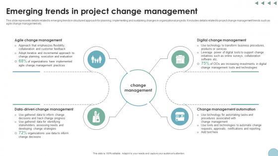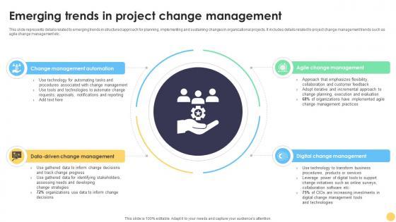 This slide represents details related to emerging trends in structured approach for planning, implementing and sustaining changes in organizational projects. It includes details related to project change management trends such as agile change management etc. Find highly impressive Emerging Trends In Project Change Management Digital Transformation In Project Management on Slidegeeks to deliver a meaningful presentation. You can save an ample amount of time using these presentation templates. No need to worry to prepare everything from scratch because Slidegeeks experts have already done a huge research and work for you. You need to download Emerging Trends In Project Change Management Digital Transformation In Project Management for your upcoming presentation. All the presentation templates are 100 percent editable and you can change the color and personalize the content accordingly. Download now This slide represents details related to emerging trends in structured approach for planning, implementing and sustaining changes in organizational projects. It includes details related to project change management trends such as agile change management etc.