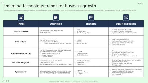 The following slide showcases various emerging trends of technology that plays crucial role in business growth and success. It showcases trends such as cloud computing, data analytics, artificial intelligence, internet of things and cyber security. Do you know about Slidesgeeks Emerging Technology Trends For Business Growth Icons Pdf These are perfect for delivering any kind od presentation. Using it, create PowerPoint presentations that communicate your ideas and engage audiences. Save time and effort by using our pre-designed presentation templates that are perfect for a wide range of topic. Our vast selection of designs covers a range of styles, from creative to business, and are all highly customizable and easy to edit. Download as a PowerPoint template or use them as Google Slides themes. The following slide showcases various emerging trends of technology that plays crucial role in business growth and success. It showcases trends such as cloud computing, data analytics, artificial intelligence, internet of things and cyber security.