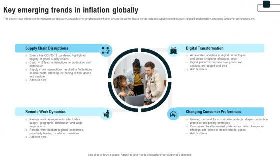 This slide shows extensive information regarding various rapidly emerging trends in inflation around the world. These trends includes supply chain disruption, digital transformation, changing consumer preferences, etc. Slidegeeks has constructed Key Emerging Trends In Inflation Globally Comprehensive Guide On Inflation Control CM SS V after conducting extensive research and examination. These presentation templates are constantly being generated and modified based on user preferences and critiques from editors. Here, you will find the most attractive templates for a range of purposes while taking into account ratings and remarks from users regarding the content. This is an excellent jumping-off point to explore our content and will give new users an insight into our top-notch PowerPoint Templates. This slide shows extensive information regarding various rapidly emerging trends in inflation around the world. These trends includes supply chain disruption, digital transformation, changing consumer preferences, etc.