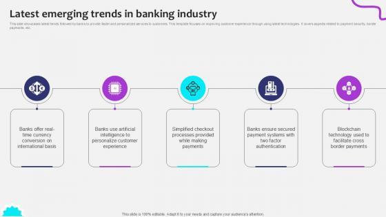 This slide showcases latest trends followed by banks to provide faster and personalized services to customers. This template focuses on improving customer experience through using latest technologies. It covers aspects related to payment security, border payments, etc. This modern and well-arranged Latest Emerging Trends In Initiating Globalization Of Banking Ppt Example provides lots of creative possibilities. It is very simple to customize and edit with the Powerpoint Software. Just drag and drop your pictures into the shapes. All facets of this template can be edited with Powerpoint, no extra software is necessary. Add your own material, put your images in the places assigned for them, adjust the colors, and then you can show your slides to the world, with an animated slide included. This slide showcases latest trends followed by banks to provide faster and personalized services to customers. This template focuses on improving customer experience through using latest technologies. It covers aspects related to payment security, border payments, etc.