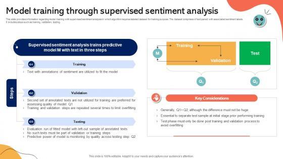 This slide provides information regarding model training with supervised sentiment analysis in which algorithm requires labeled dataset for training purpose. The dataset comprises of text paired with associated sentiment labels. It includes steps such as training, validation, testing. Boost your pitch with our creative Model Training Through Supervised Sentiment Analysis Emotionally Intelligent Insights Leveraging AI SS V. Deliver an awe-inspiring pitch that will mesmerize everyone. Using these presentation templates you will surely catch everyones attention. You can browse the ppts collection on our website. We have researchers who are experts at creating the right content for the templates. So you do not have to invest time in any additional work. Just grab the template now and use them. This slide provides information regarding model training with supervised sentiment analysis in which algorithm requires labeled dataset for training purpose. The dataset comprises of text paired with associated sentiment labels. It includes steps such as training, validation, testing.