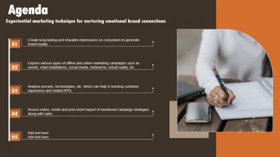 Find a pre-designed and impeccable Agenda Experiential Marketing Technique For Nurturing Emotional Brand Connections Professional PDF. The templates can ace your presentation without additional effort. You can download these easy-to-edit presentation templates to make your presentation stand out from others. So, what are you waiting for Download the template from Slidegeeks today and give a unique touch to your presentation. Our Agenda Experiential Marketing Technique For Nurturing Emotional Brand Connections Professional PDF are topically designed to provide an attractive backdrop to any subject. Use them to look like a presentation pro.