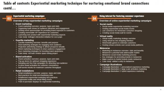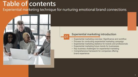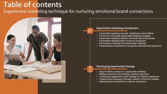 Slidegeeks is here to make your presentations a breeze with Table Of Contents Experiential Marketing Technique For Nurturing Emotional Brand Connections Structure PDF With our easy-to-use and customizable templates, you can focus on delivering your ideas rather than worrying about formatting. With a variety of designs to choose from, you are sure to find one that suits your needs. And with animations and unique photos, illustrations, and fonts, you can make your presentation pop. So whether you are giving a sales pitch or presenting to the board, make sure to check out Slidegeeks first Our Table Of Contents Experiential Marketing Technique For Nurturing Emotional Brand Connections Structure PDF are topically designed to provide an attractive backdrop to any subject. Use them to look like a presentation pro.