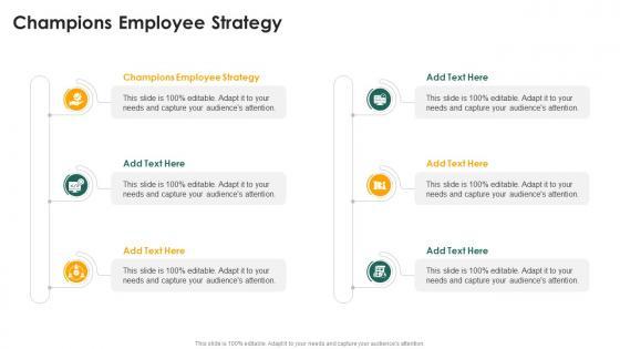 Introducing our well-designed Champions Employee Strategy This PowerPoint design presents information on topics like Champions Employee Strategy As it is predesigned it helps boost your confidence level. It also makes you a better presenter because of its high-quality content and graphics. This PPT layout can be downloaded and used in different formats like PDF, PNG, and JPG. Not only this, it is available in both Standard Screen and Widescreen aspect ratios for your convenience. Therefore, click on the download button now to persuade and impress your audience. Our Champions Employee Strategy In Powerpoint And Google Slides Cpb are topically designed to provide an attractive backdrop to any subject. Use them to look like a presentation pro.