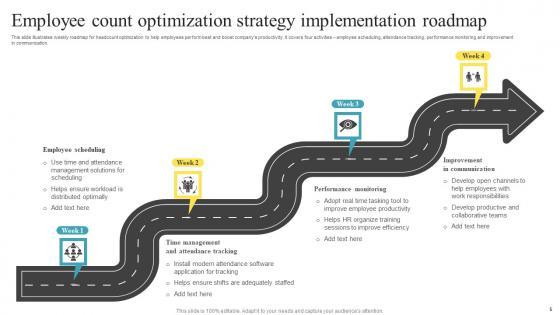 This slide illustrates weekly roadmap for headcount optimization to help employees perform best and boost companys productivity. It covers four activities employee scheduling, attendance tracking, performance monitoring and improvement in communication. Showcasing this set of slides titled Employee Count Optimization Strategy Implementation Roadmap Topics Pdf. The topics addressed in these templates are Employee Scheduling, Performance Monitoring, Improvement Communication . All the content presented in this PPT design is completely editable. Download it and make adjustments in color, background, font etc. as per your unique business setting. This slide illustrates weekly roadmap for headcount optimization to help employees perform best and boost companys productivity. It covers four activities employee scheduling, attendance tracking, performance monitoring and improvement in communication.