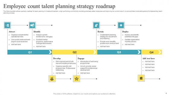 The following slide outlines quarterly roadmap for talent planning to create and maintain a high performing workforce by recruiting potentially skilled employees and improving the current ones. It covers activities conducted quarterly for implementing talent planning process Showcasing this set of slides titled Employee Count Talent Planning Strategy Roadmap Mockup Pdf. The topics addressed in these templates are Attract, Identify, Retain, Deploy. All the content presented in this PPT design is completely editable. Download it and make adjustments in color, background, font etc. as per your unique business setting. The following slide outlines quarterly roadmap for talent planning to create and maintain a high performing workforce by recruiting potentially skilled employees and improving the current ones. It covers activities conducted quarterly for implementing talent planning process