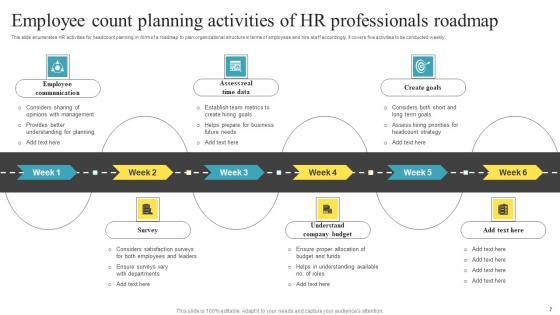 This slide enumerates HR activities for headcount planning in form of a roadmap to plan organizational structure in terms of employees and hire staff accordingly. It covers five activities to be conducted weekly. Pitch your topic with ease and precision using this Employee Count Planning Activities Of HR Professionals Roadmap Formats Pdf. This layout presents information on Employee Communication, Assess Real, Time Data Create Goals . It is also available for immediate download and adjustment. So, changes can be made in the color, design, graphics or any other component to create a unique layout. This slide enumerates HR activities for headcount planning in form of a roadmap to plan organizational structure in terms of employees and hire staff accordingly. It covers five activities to be conducted weekly.
