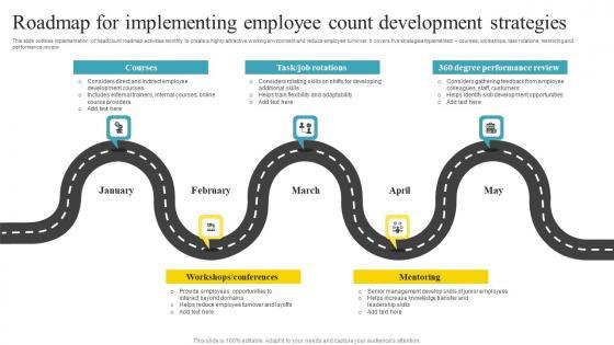 This slide outlines implementation of headcount roadmap activities monthly to create a highly attractive working environment and reduce employee turnover. It covers five strategies implemented courses, workshops, task rotations, mentoring and performance review Pitch your topic with ease and precision using this Roadmap For Implementing Employee Count Development Strategies Elements Pdf. This layout presents information on Courses, Workshops Conferences, Mentoring. It is also available for immediate download and adjustment. So, changes can be made in the color, design, graphics or any other component to create a unique layout. This slide outlines implementation of headcount roadmap activities monthly to create a highly attractive working environment and reduce employee turnover. It covers five strategies implemented courses, workshops, task rotations, mentoring and performance review