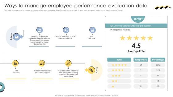 This slide illustrate ways to manage employee performance evaluation data effectively and proactively. It ways such as reports, tables format, development of cars etc. Here you can discover an assortment of the finest PowerPoint and Google Slides templates. With these templates, you can create presentations for a variety of purposes while simultaneously providing your audience with an eye-catching visual experience. Download Skill Enhancement Performance Ways To Manage Employee Performance Evaluation Data to deliver an impeccable presentation. These templates will make your job of preparing presentations much quicker, yet still, maintain a high level of quality. Slidegeeks has experienced researchers who prepare these templates and write high-quality content for you. Later on, you can personalize the content by editing the Skill Enhancement Performance Ways To Manage Employee Performance Evaluation Data. This slide illustrate ways to manage employee performance evaluation data effectively and proactively. It ways such as reports, tables format, development of cars etc.