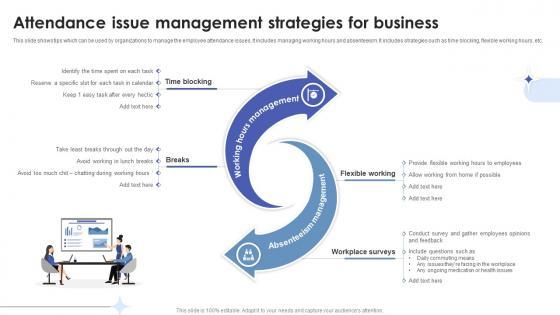 This slide shows tips which can be used by organizations to manage the employee attendance issues. It includes managing working hours and absenteeism. It includes strategies such as time blocking, flexible working hours, etc. Slidegeeks is one of the best resources for PowerPoint templates. You can download easily and regulate Employee Relations In Human Resource Attendance Issue Management Strategies For Business for your personal presentations from our wonderful collection. A few clicks is all it takes to discover and get the most relevant and appropriate templates. Use our Templates to add a unique zing and appeal to your presentation and meetings. All the slides are easy to edit and you can use them even for advertisement purposes. This slide shows tips which can be used by organizations to manage the employee attendance issues. It includes managing working hours and absenteeism. It includes strategies such as time blocking, flexible working hours, etc.