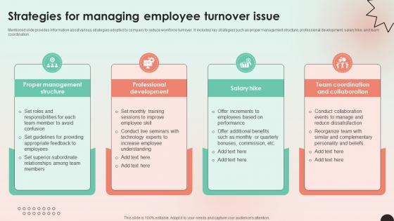 Mentioned slide provides information about various strategies adopted by company to reduce workforce turnover. It includes key strategies such as proper management structure, professional development, salary hike, and team coordination. From laying roadmaps to briefing everything in detail, our templates are perfect for you. You can set the stage with your presentation slides. All you have to do is download these easy-to-edit and customizable templates. Managing Technical And Non Strategies For Managing Employee Turnover Issue will help you deliver an outstanding performance that everyone would remember and praise you for. Do download this presentation today. Mentioned slide provides information about various strategies adopted by company to reduce workforce turnover. It includes key strategies such as proper management structure, professional development, salary hike, and team coordination.
