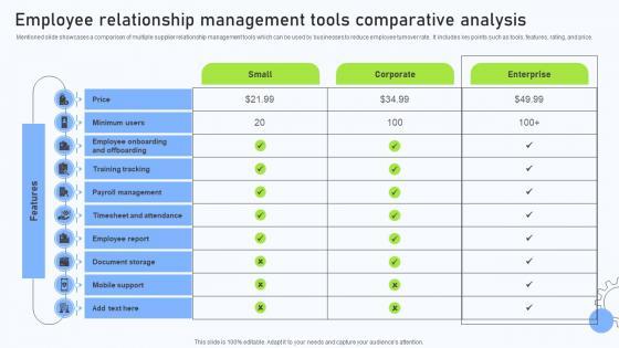 Mentioned slide showcases a comparison of multiple supplier relationship management tools which can be used by businesses to reduce employee turnover rate. It includes key points such as tools, features, rating, and price. Coming up with a presentation necessitates that the majority of the effort goes into the content and the message you intend to convey. The visuals of a PowerPoint presentation can only be effective if it supplements and supports the story that is being told. Keeping this in mind our experts created Employee Relationship Management Tools Comparative Analysis Template PDF to reduce the time that goes into designing the presentation. This way, you can concentrate on the message while our designers take care of providing you with the right template for the situation.