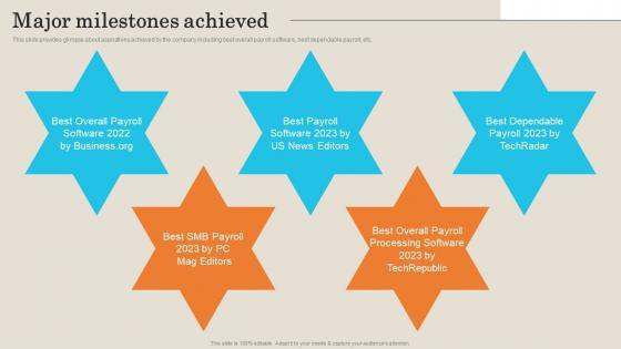 This slide provides glimpse about aspirations achieved by the company including best overall payroll software, best dependable payroll, etc. If your project calls for a presentation, then Slidegeeks is your go-to partner because we have professionally designed, easy-to-edit templates that are perfect for any presentation. After downloading, you can easily edit Major Milestones Employee Management Platform Investor Funding Presentation Infographics Pdf and make the changes accordingly. You can rearrange slides or fill them with different images. Check out all the handy templates This slide provides glimpse about aspirations achieved by the company including best overall payroll software, best dependable payroll, etc.