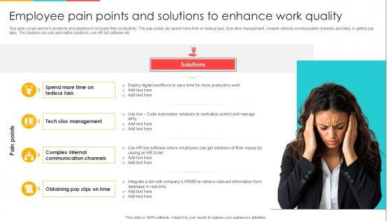 This slide covers workers problems and solutions to increase their productivity. The pain points are spend more time on tedious task, tech silos management, complex internal communication channels and delay in getting pay slips. The solutions are use automation solutions, use HR bot software etc. Do you have an important presentation coming up Are you looking for something that will make your presentation stand out from the rest Look no further than Employee Pain Points And Solutions To Enhance Work Quality Ppt Example SS. With our professional designs, you can trust that your presentation will pop and make delivering it a smooth process. And with Slidegeeks, you can trust that your presentation will be unique and memorable. So why wait Grab Employee Pain Points And Solutions To Enhance Work Quality Ppt Example SS today and make your presentation stand out from the rest This slide covers workers problems and solutions to increase their productivity. The pain points are spend more time on tedious task, tech silos management, complex internal communication channels and delay in getting pay slips. The solutions are use automation solutions, use HR bot software etc.
