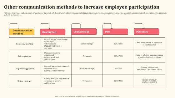 Following slide shows methods used by organizations to promote effective communication. It includes methods such as company meetings, focus groups, grapevine approach, union contract with description, date, responsible authority and outcomes. There are so many reasons you need a Other Communication Methods To Increase Employee Participation Detailed Personnel Inspiration Pdf The first reason is you can not spend time making everything from scratch, Thus, Slidegeeks has made presentation templates for you too. You can easily download these templates from our website easily. Following slide shows methods used by organizations to promote effective communication. It includes methods such as company meetings, focus groups, grapevine approach, union contract with description, date, responsible authority and outcomes.