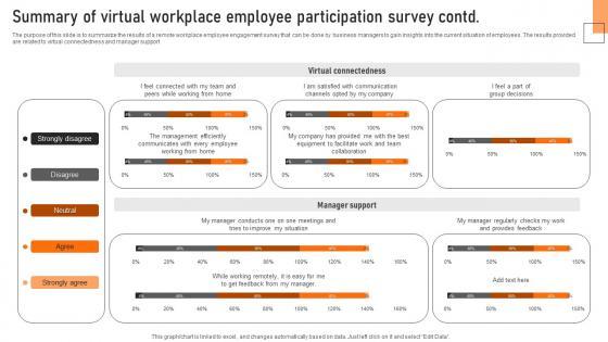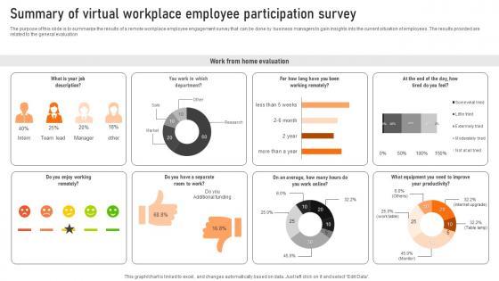 The purpose of this slide is to summarize the results of a remote workplace employee engagement survey that can be done by business managers to gain insights into the current situation of employees. The results provided are related to the general evaluation Showcasing this set of slides titled Summary Of Virtual Workplace Employee Participation Survey Survey Ss The topics addressed in these templates are Home Evaluation, Department, Productivity All the content presented in this PPT design is completely editable. Download it and make adjustments in color, background, font etc. as per your unique business setting. The purpose of this slide is to summarize the results of a remote workplace employee engagement survey that can be done by business managers to gain insights into the current situation of employees. The results provided are related to the general evaluation