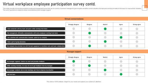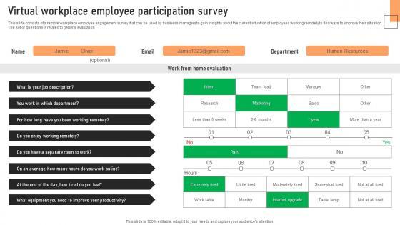 This slide consists of a remote workplace employee engagement survey that can be used by business managers to gain insights about the current situation of employees working remotely to find ways to improve their situation. The set of questions is related to general evaluation Pitch your topic with ease and precision using this Virtual Workplace Employee Participation Survey Survey Ss This layout presents information on Department, Productivity, Equipment It is also available for immediate download and adjustment. So, changes can be made in the color, design, graphics or any other component to create a unique layout. This slide consists of a remote workplace employee engagement survey that can be used by business managers to gain insights about the current situation of employees working remotely to find ways to improve their situation. The set of questions is related to general evaluation