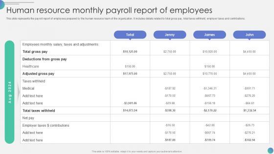 This slide represents the payroll report of employees prepared by the human resource team of the organization. It includes details related to total gross pay, total taxes withheld, employer taxes and contributions. Slidegeeks has constructed Human Resource Monthly Payroll Report Of Employees PPT Slide SS after conducting extensive research and examination. These presentation templates are constantly being generated and modified based on user preferences and critiques from editors. Here, you will find the most attractive templates for a range of purposes while taking into account ratings and remarks from users regarding the content. This is an excellent jumping-off point to explore our content and will give new users an insight into our top-notch PowerPoint Templates. This slide represents the payroll report of employees prepared by the human resource team of the organization. It includes details related to total gross pay, total taxes withheld, employer taxes and contributions.