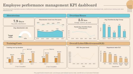 The following slide depicts the overview of staff performance management system to achieve goals and evaluate business growth. It includes key elements such as absenteeism rate, overtime hours, training costs, labor effectiveness etc. Find highly impressive Employee Performance Management Kpi Dashboard Executing Successful Staff Performance Elements Pdf on Slidegeeks to deliver a meaningful presentation. You can save an ample amount of time using these presentation templates. No need to worry to prepare everything from scratch because Slidegeeks experts have already done a huge research and work for you. You need to download Employee Performance Management Kpi Dashboard Executing Successful Staff Performance Elements Pdf for your upcoming presentation. All the presentation templates are 100 percent editable and you can change the color and personalize the content accordingly. Download now. The following slide depicts the overview of staff performance management system to achieve goals and evaluate business growth. It includes key elements such as absenteeism rate, overtime hours, training costs, labor effectiveness etc.