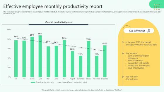 This slide graphically provides information about employee monthly productivity. It includes key reasons for low employee productivity such as lack of skill training, poor supervision, inconsistent targets, inadequate technologies, lack of motivation, etc. If your project calls for a presentation, then Slidegeeks is your go-to partner because we have professionally designed, easy-to-edit templates that are perfect for any presentation. After downloading, you can easily edit Effective Employee Monthly Productivity Report Analysing Hr Data For Effective Decision Making and make the changes accordingly. You can rearrange slides or fill them with different images. Check out all the handy templates This slide graphically provides information about employee monthly productivity. It includes key reasons for low employee productivity such as lack of skill training, poor supervision, inconsistent targets, inadequate technologies, lack of motivation, etc.