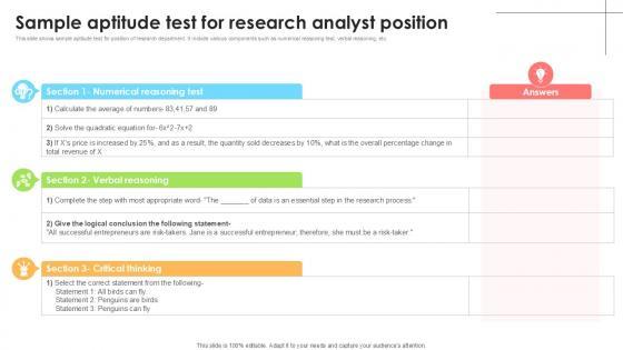 This slide shows sample aptitude test for position of research department. It include various components such as numerical reasoning test, verbal reasoning, etc. Coming up with a presentation necessitates that the majority of the effort goes into the content and the message you intend to convey. The visuals of a PowerPoint presentation can only be effective if it supplements and supports the story that is being told. Keeping this in mind our experts created Sample Aptitude Test For Research Employee Attraction And Competency Ppt Example to reduce the time that goes into designing the presentation. This way, you can concentrate on the message while our designers take care of providing you with the right template for the situation. This slide shows sample aptitude test for position of research department. It include various components such as numerical reasoning test, verbal reasoning, etc.