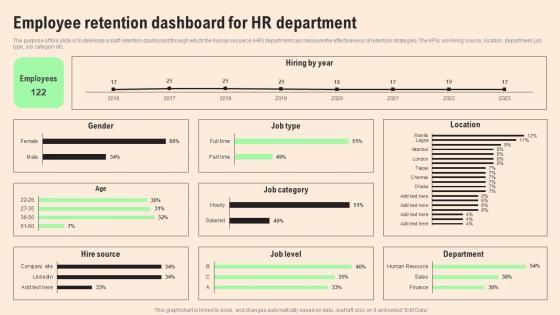 The purpose of this slide is to delineate a staff retention dashboard through which the human resource HR department can measure the effectiveness of retention strategies. The KPIs are hiring source, location, department, job type, job category etc. Take your projects to the next level with our ultimate collection of Successful Staff Retention Techniques Employee Retention Dashboard For Hr Department Template PDF. Slidegeeks has designed a range of layouts that are perfect for representing task or activity duration, keeping track of all your deadlines at a glance. Tailor these designs to your exact needs and give them a truly corporate look with your own brand colors they will make your projects stand out from the rest.