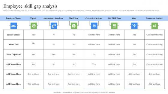 Purpose of the following slide is to analyze the various skills required for managing and monitoring RPA and Hyperautomation, the provided table analyses is there is any Gap in the skillset and recommends corrective action. This Deployment Procedure Of Hyper Automation Employee Skill Gap Analysis Professional PDF from Slidegeeks makes it easy to present information on your topic with precision. It provides customization options, so you can make changes to the colors, design, graphics, or any other component to create a unique layout. It is also available for immediate download, so you can begin using it right away. Slidegeeks has done good research to ensure that you have everything you need to make your presentation stand out. Make a name out there for a brilliant performance.