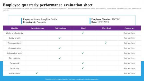 This slide showcases quarterly plan that can help our business to evaluate employee performance quality. It includes works to full potential, quality of work, work consistency, communication, independent work, takes initiative, group work, etc. If your project calls for a presentation, then Slidegeeks is your go-to partner because we have professionally designed, easy-to-edit templates that are perfect for any presentation. After downloading, you can easily edit Employee Quarterly Performance Evaluation Sheet Strategic Talent Recruitment Pictures Pdf and make the changes accordingly. You can rearrange slides or fill them with different images. Check out all the handy templates This slide showcases quarterly plan that can help our business to evaluate employee performance quality. It includes works to full potential, quality of work, work consistency, communication, independent work, takes initiative, group work, etc.