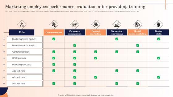 This slide shows employees performance evaluation matrix of new marketing employees . It includes various skills such as communication, campaign management, content marketing, etc. The Marketing Employees Performance Evaluation Strategic Marketing Campaign Icons Pdf is a compilation of the most recent design trends as a series of slides. It is suitable for any subject or industry presentation, containing attractive visuals and photo spots for businesses to clearly express their messages. This template contains a variety of slides for the user to input data, such as structures to contrast two elements, bullet points, and slides for written information. Slidegeeks is prepared to create an impression. This slide shows employees performance evaluation matrix of new marketing employees . It includes various skills such as communication, campaign management, content marketing, etc.