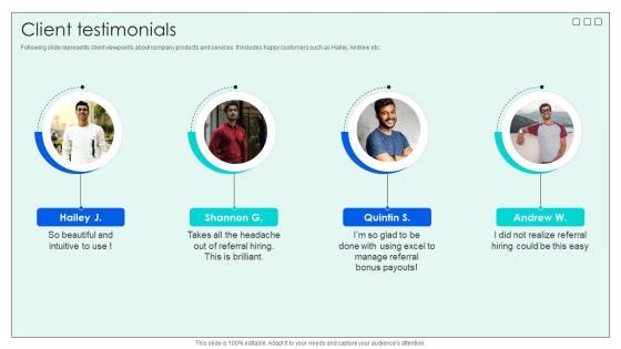 Following slide represents client viewpoints about company products and services. It includes happy customers such as Hailey, Andrew etc. Create an editable Client Testimonials Investor Funding Elevator Pitch Deck For Effective Employee Hiring that communicates your idea and engages your audience. Whether you are presenting a business or an educational presentation, pre-designed presentation templates help save time. Client Testimonials Investor Funding Elevator Pitch Deck For Effective Employee Hiring is highly customizable and very easy to edit, covering many different styles from creative to business presentations. Slidegeeks has creative team members who have crafted amazing templates. So, go and get them without any delay. Following slide represents client viewpoints about company products and services. It includes happy customers such as Hailey, Andrew etc.