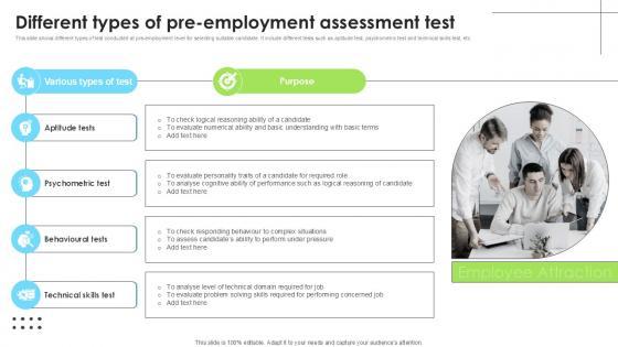 This slide shows different types of test conducted at pre-employment level for selecting suitable candidate. It include different tests such as aptitude test, psychometric test and technical skills test, etc. Get a simple yet stunning designed Different Types Of Pre Employment Employee Attraction And Competency Ppt Slide. It is the best one to establish the tone in your meetings. It is an excellent way to make your presentations highly effective. So, download this PPT today from Slidegeeks and see the positive impacts. Our easy-to-edit Different Types Of Pre Employment Employee Attraction And Competency Ppt Slide can be your go-to option for all upcoming conferences and meetings. So, what are you waiting for Grab this template today. This slide shows different types of test conducted at pre-employment level for selecting suitable candidate. It include different tests such as aptitude test, psychometric test and technical skills test, etc.