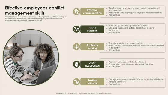This slide shows various skills which can be used by organizations or HRs to manage or resolve conflicts at work place. It includes details regarding skills such as effective communication, active listening, problem solving, etc. Do you have an important presentation coming up Are you looking for something that will make your presentation stand out from the rest Look no further than Human Resource Industrial Relationship Effective Employees Conflict Management Skills. With our professional designs, you can trust that your presentation will pop and make delivering it a smooth process. And with Slidegeeks, you can trust that your presentation will be unique and memorable. So why wait Grab Human Resource Industrial Relationship Effective Employees Conflict Management Skills today and make your presentation stand out from the rest This slide shows various skills which can be used by organizations or HRs to manage or resolve conflicts at work place. It includes details regarding skills such as effective communication, active listening, problem solving, etc.